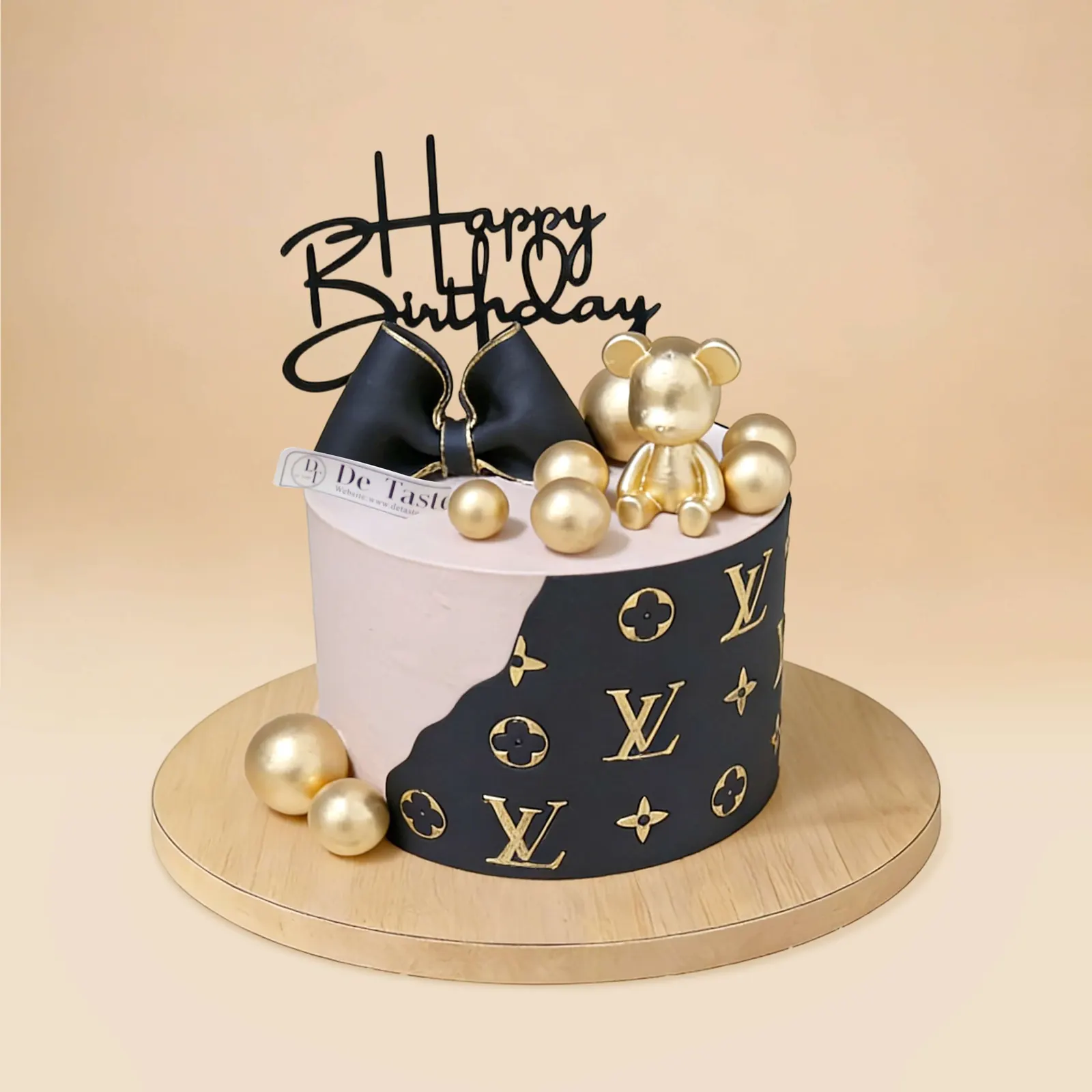 This visually striking cake boasts a lavish aesthetic. The classic LV monogram and gold detailing on one side create a sophisticated look, while the simple black design with golden spheres on the other adds depth and dimension.
