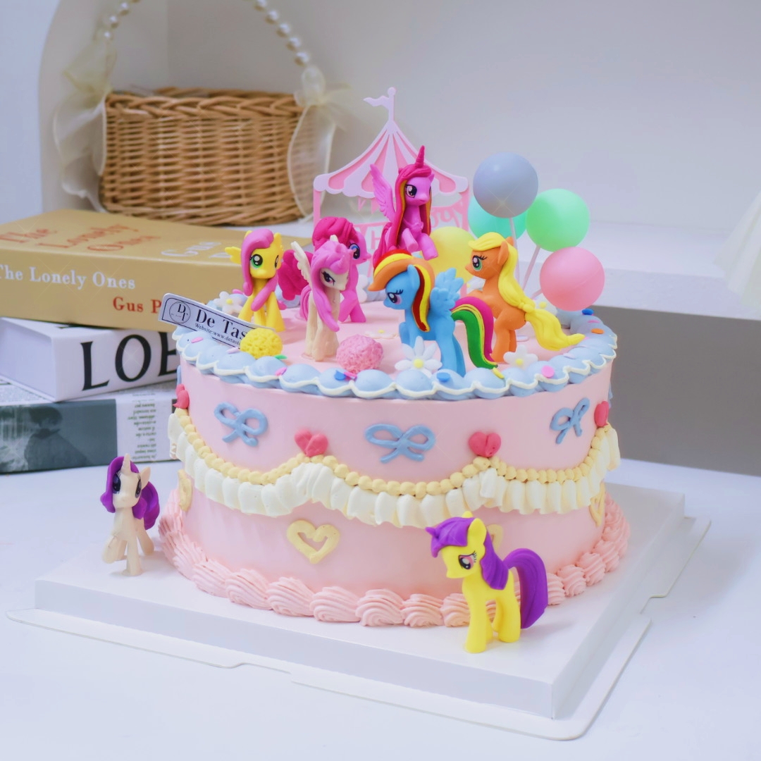 This cake features a unicorn theme, with soft pink colors that perfectly capture a girly aesthetic. The overall impression is that of a whimsical amusement park.