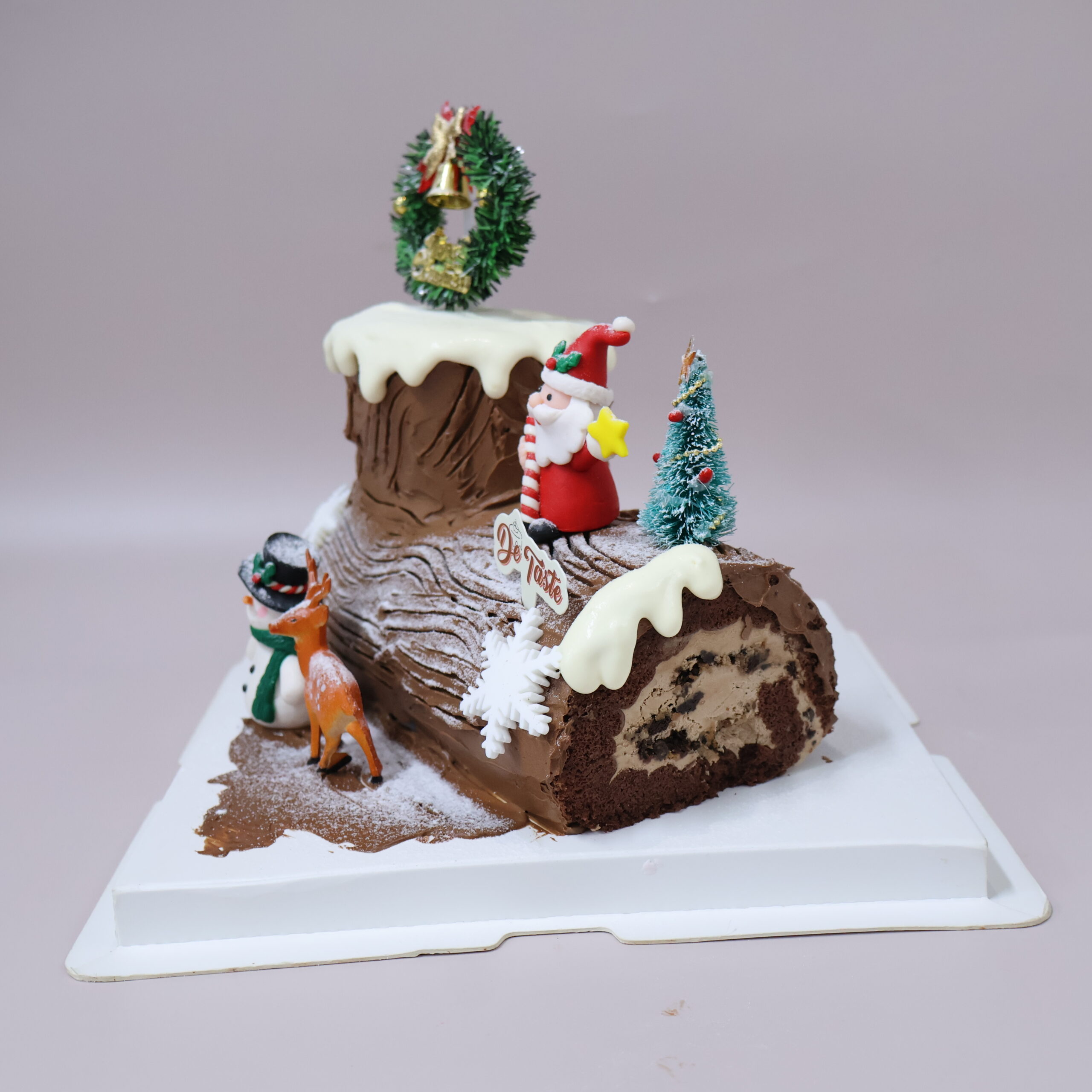 This is a Christmas-themed cake. It’s shaped like a chocolate Yule log, dusted with powdered sugar to resemble snow. The cake is decorated with several figurines, including Santa Claus, a snowman, and a reindeer. There’s also a small Christmas tree and a “Merry Christmas” wreath on top. The cake sits on a white square base